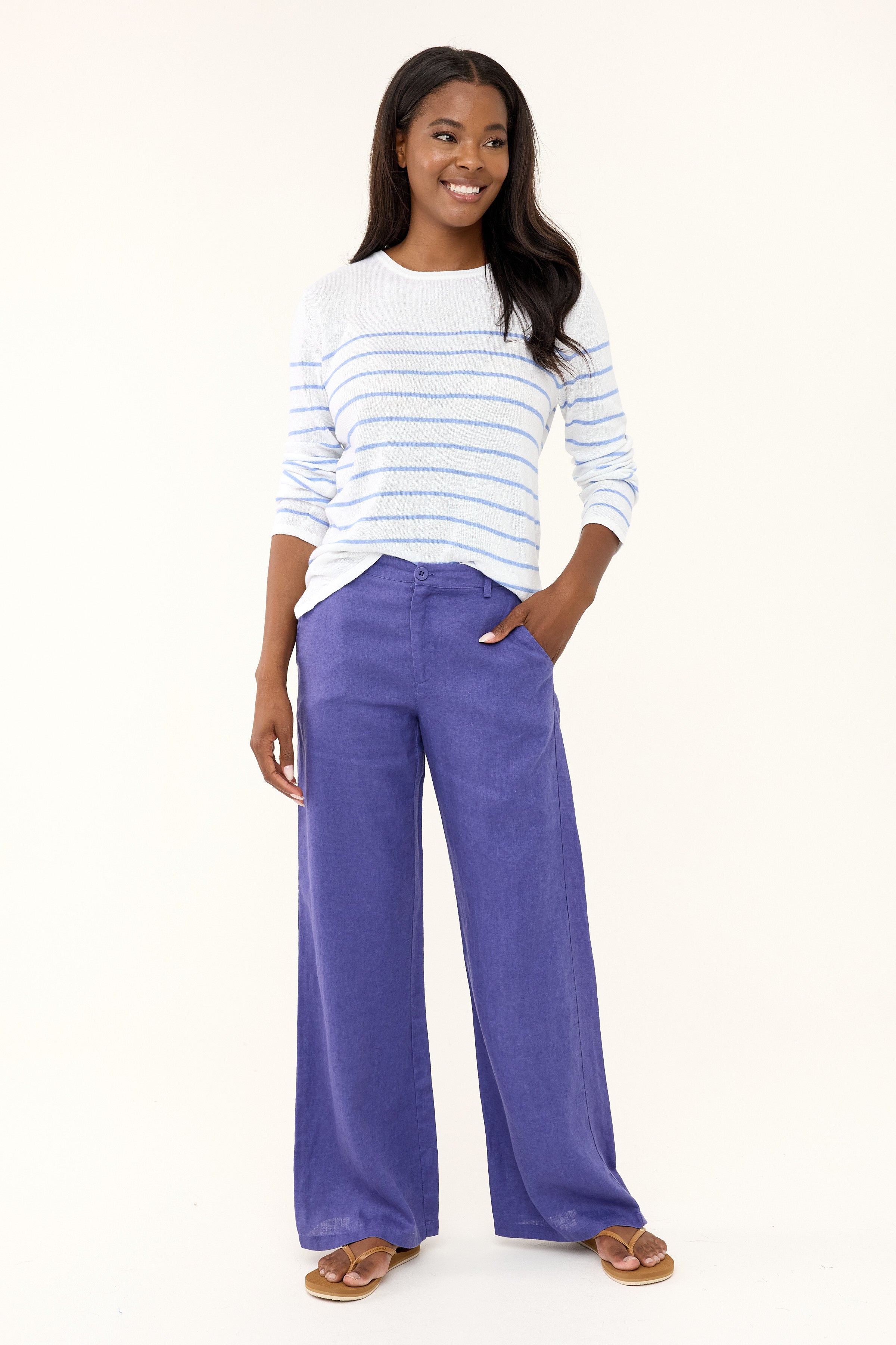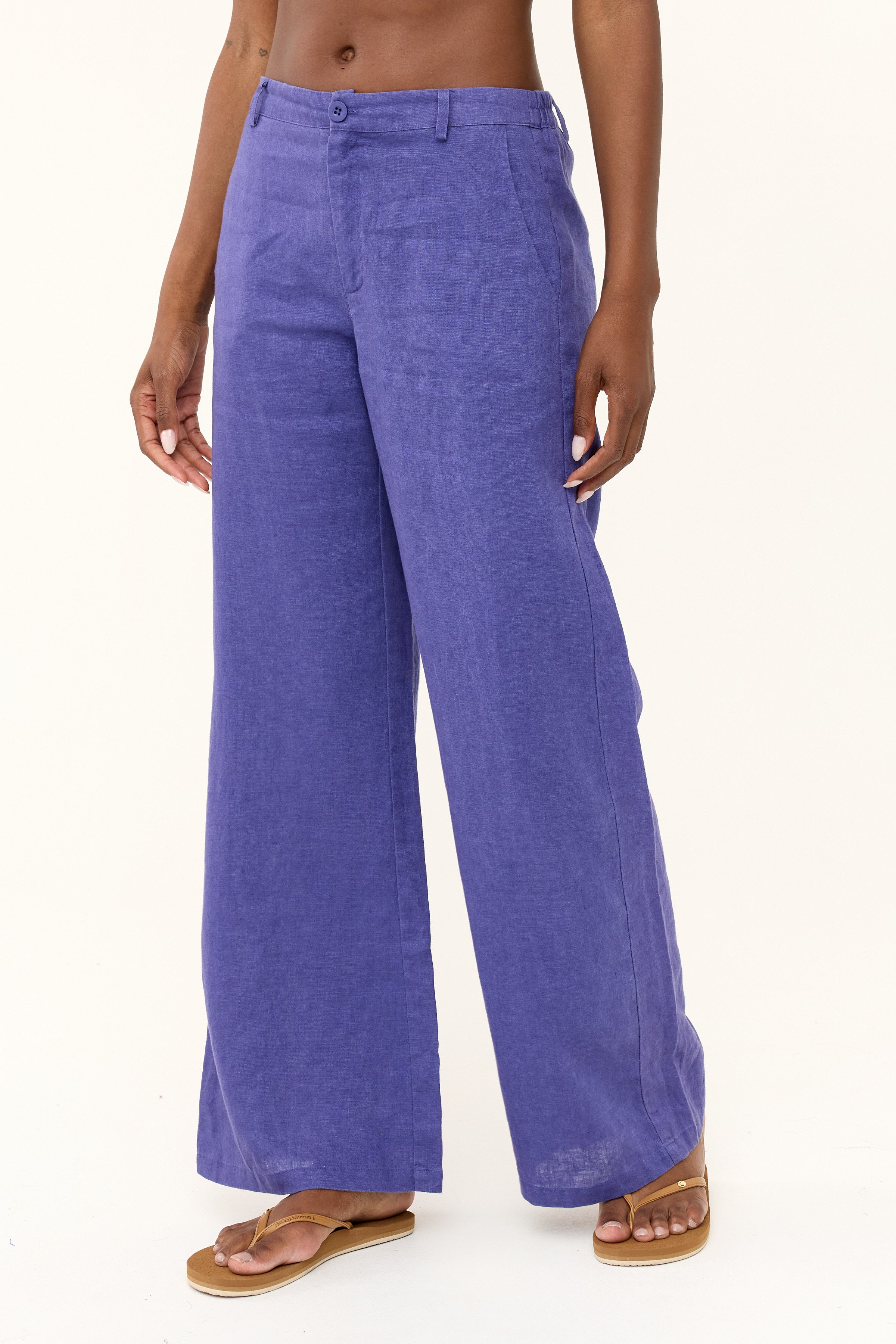 Our new Izzy linen trouser silhouette featuring a button front, zipper and belt loops.