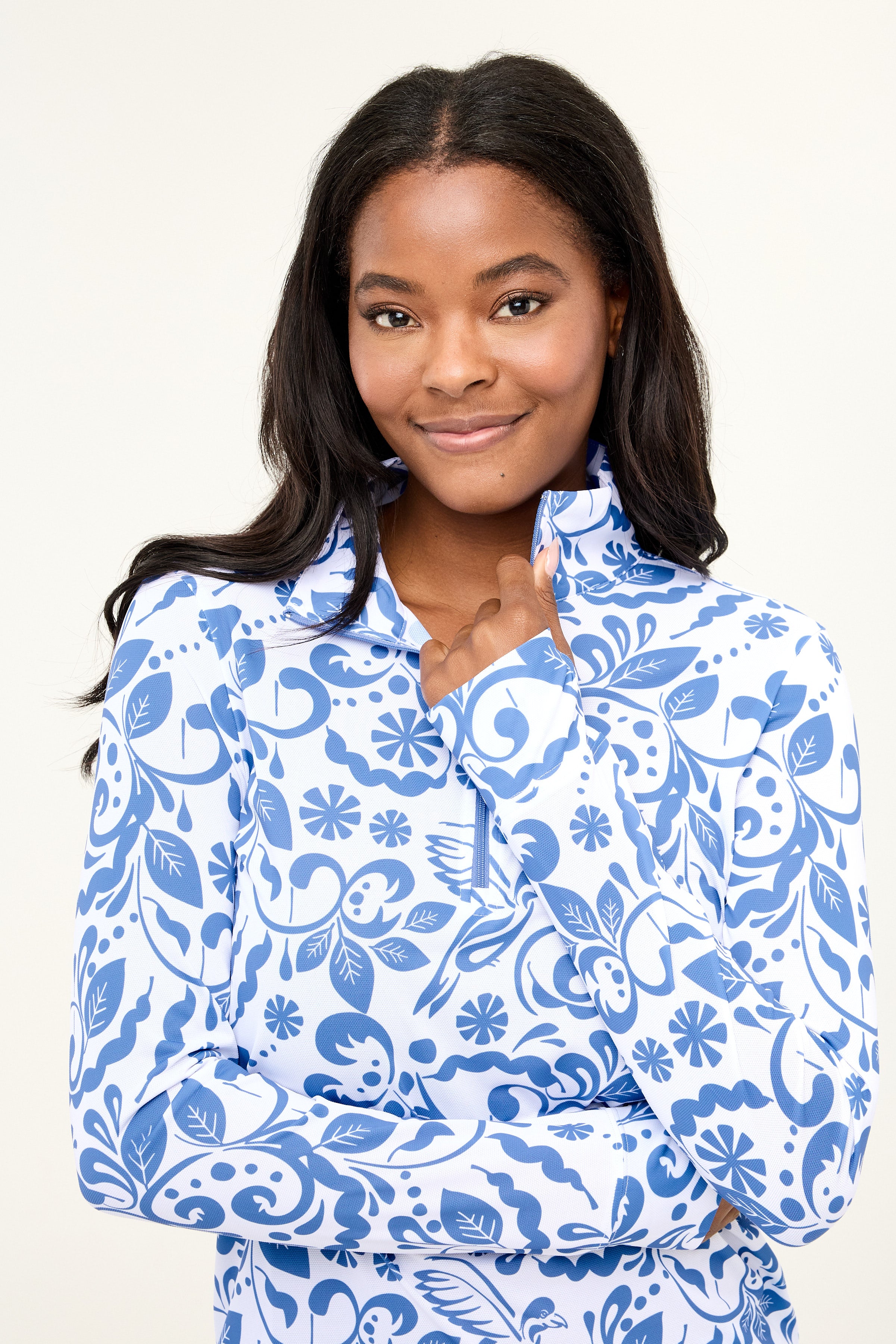 - 1/4 zip and mock neck collar; thumb holes for extra sun protection